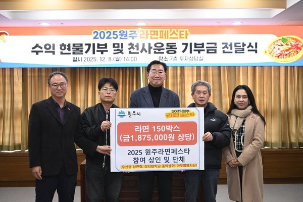 이번 기부에는 지난 9월 상지대학교 노천극장에서 열린 ‘2025원주라면페스타’에서 음식 부스를 운영한 지역 상인들과 상지대학교 총학생회가 참여했다.