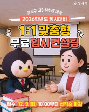 [뉴스파이어] 서울 강서구 가 2026 학년도 대학 정시모집을 앞두고 관내 고등학교 3 학년과 재수생, 학부모를 대상으로 ‘1 대 1 맞춤형 대입 진학 컨설팅 ’을 운영한다.컨설팅은 오는 12월 20일부터 21일까지 이틀간 강서평생학습관 2층 강당에서 진행된다.구는 정시모집 정보를 해석하고 전략을 수립하는 데 어려움을 겪는 학생과 학부모에게 실질적 도움을 제공하기 위해 이번 프로그램을 마련했다.서울시교육청 대학진학지도지원단 소속 현직 교사 6명이 참여해 수험생의 학업 성향과 진로 목표를 분석하고 개인별 입시 전략을 제시한다.상담은